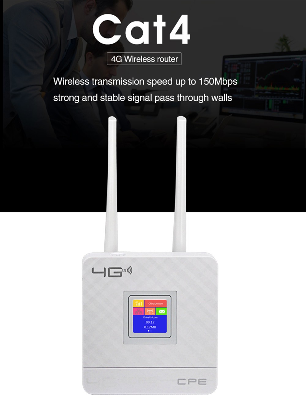 CPE903 je vysoce výkonný 4G bezdrátový router se slotem pro 4G sim kartu a síťovým procesorem MIPS, jedná se o řešení pro podnikové, domácí, firemní a kancelářské sítě Wi - Fi. Je kompatibilní se standardem IEEE 802.11b/g/n, přenosová rychlost dosahuje až 300 Mbps. Díky duální externí anténě je signál Wi - Fi stabilnější a má delší dosah. Podporuje 10 uživatelů Wi - Fi současně.